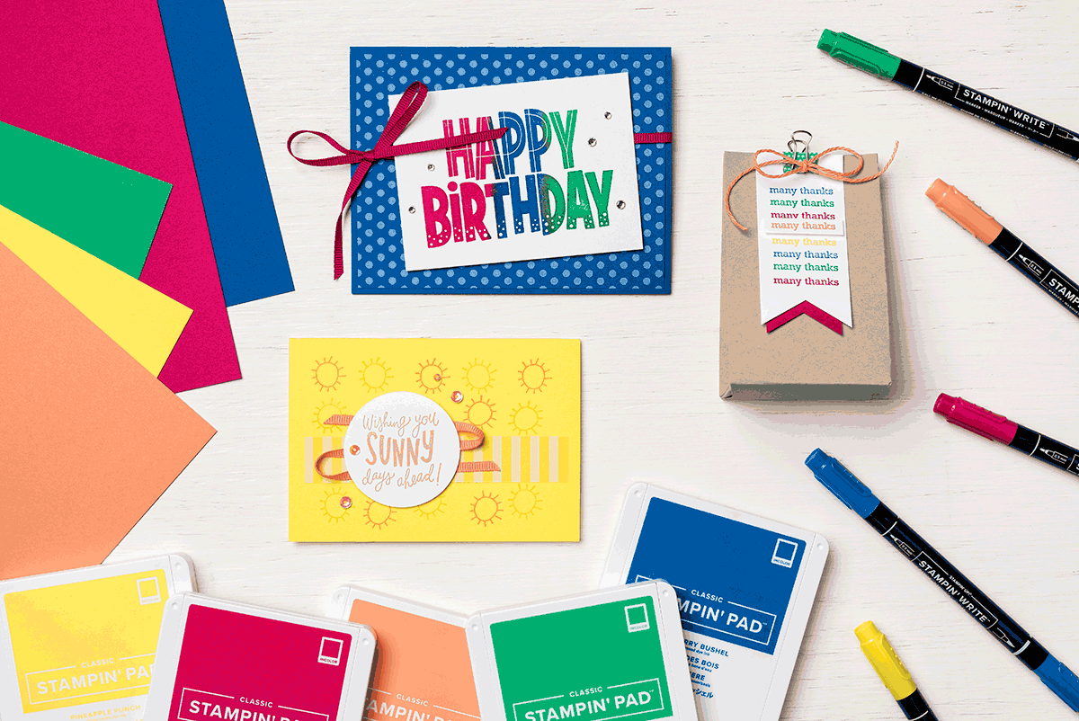 First up are these cute cards featuring the 2018–20 In Colors! Including Blueberry Bushel, Call Me Clover, Grapefruit Grove, Lovely Lipstick, and Pineapple Punch, these colors are a bouquet of hues that lend well to any project.