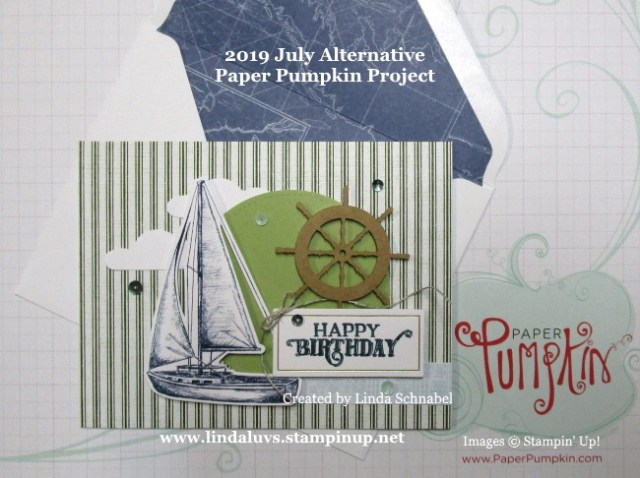 Are you always struggling to come up with card designs? Let me help you by introducing “kits” that work well together. Today I am taking the base from one of the cards included in the July 2019 Paper Pumpkin kit and pairing it up with some of the amazing contents in the Come Sail Away Memories & More Card Kit. Creating with any of our card kits makes designing cards so easy.