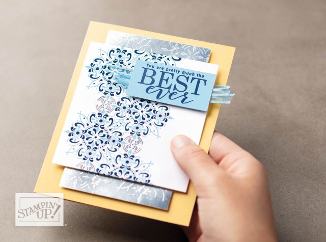 The All Adorned Photopolymer Stamp Set … it’s perfect for creating backgrounds, focal points and more with these graceful designs. Here is another sample created with the All Adorned stamp set.