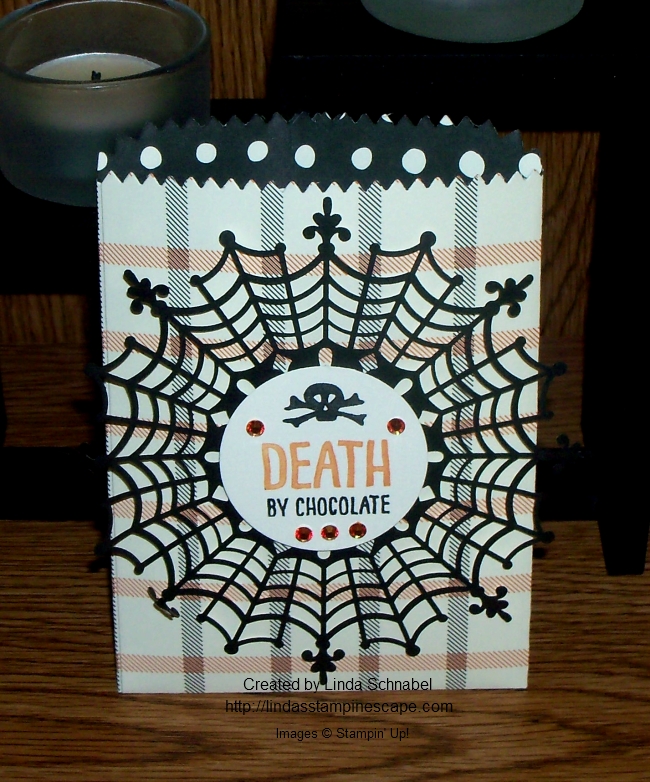 Oh so cute!! But now it’s time to check out my updated version … same Curvy Keepsake Box Thinlits die but I’m using the Happy Haunting Designer Series Paper and the Spider Web Doilies (currently on back order).