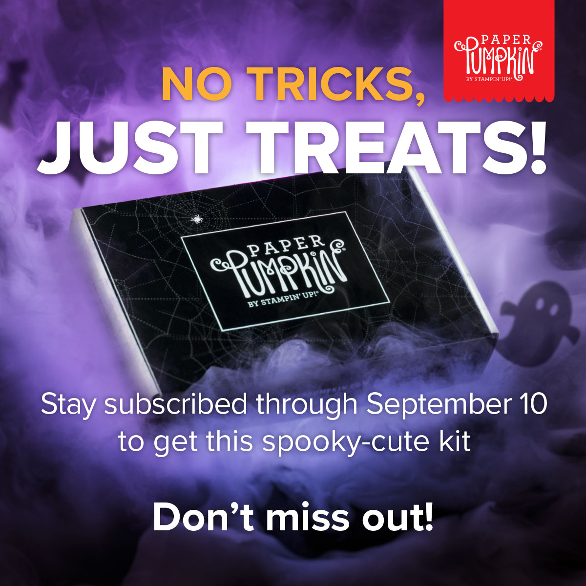 October is on its way! And when hordes of little ghosts and goblins descend on your doorstep this Halloween, be prepared with spooky-cute goodies just for them—handmade by you with a little help from Paper Pumpkin. How? Simply subscribe by September 10 at … https://www.paperpumpkin.com/en-us/sign-up/?demoid=26646 .