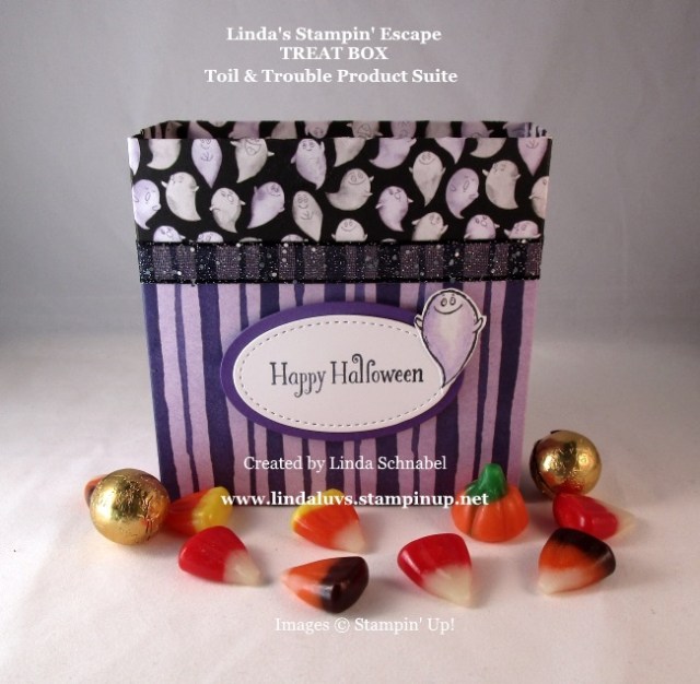Love the pattern of this paper … you could slip off the Halloween greeting and add a Thanksgiving greeting! Who wouldn’t love a cute little treat box filled with chocolate!
