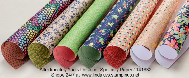 Here I used the “Affectionately Yours Specialty Designer paper”. This designer paper patterns consist of colorful floral designs which include some with copper foil. My greeting comes from my latest “go to” stamp set … “Suite Sentiments”. This is a basic design using my paper cutter to cut out my greeting mat.