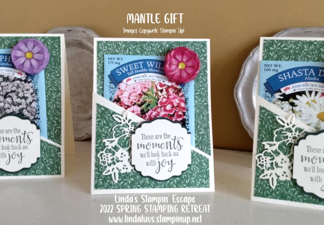As my guests come into the dining room, over the fireplace …. they find what I call my Mantle Gifts! Each retreat I decorate the mantle with a hand crafted gift that they get to take home at the end of the retreat. These are actual “pocket cards” and a seed packet was tucked inside to they have a “living” remembrance of our retreat. Each seed packet is adorned with a flower … which is actual chocolate! We all know how good chocolate and stamping go together!