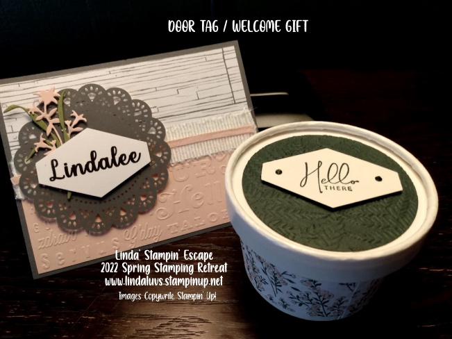 I have a peek into our stamping retreat for you … I will share a bit more in the coming days as well. I will begin with the door tags … Each guest has a name tag on their door so they know which room the will be staying in and they are free to take it home with them. They can easily pop the name off and turn it into a card!