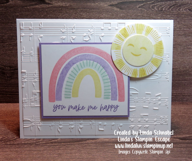 This card pays homage to the song “You are my Sunshine” …. Thus the Merrry Melody 3-D Embossing Folder. The Rainbow was stamped with Flirty Flamingo, Highland Heather, Pool Party, and Daffodil Delight … they were inked up, stamped off and then stamped onto the Basic White front. Then fully inked, the “rays” were inked up with Pool Party and stamped over the Pool Party band that was stamped off. Add a little Wink of Stella for a bit of sparkle.