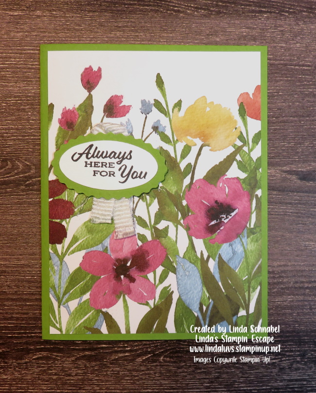 I used the Stitched Greenery die (Retiring) to create texture and a cool background for my floral piece … I matted the designer paper with Polished Pink and then a Granny Apple Green background. My granddaughters love this color combination. I also used the Iridescent Rhinestones on this card. My sentiment … that comes from the Happiness Abounds.