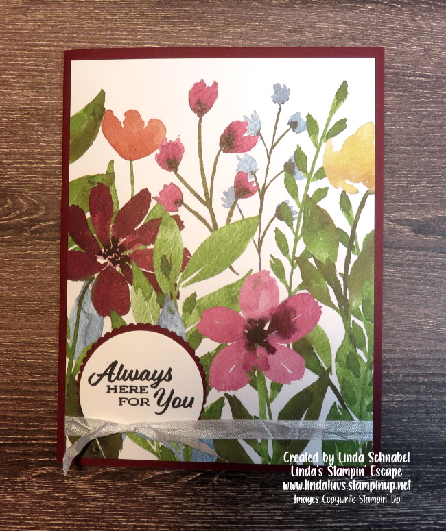 I also stamped directly onto the card base to create some depth and interest to the card. The leaves come from the Happiness Abounds as does the greeting. The mat and cardbase are Merry Merlot (Retiring)… it truly changes the look of the card and gives it a beautiful deep look. I completed my card with the white ribbon and Brass Butterflies.