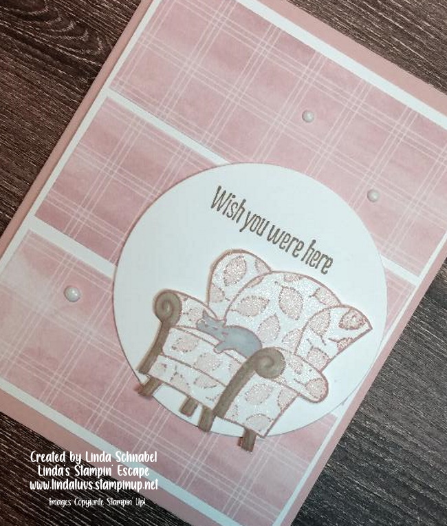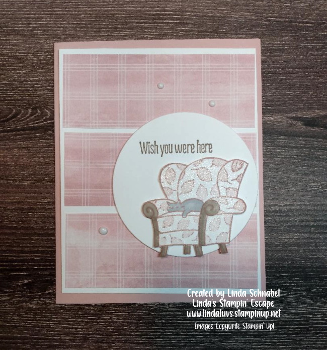 Same dimensions on this card, however I used a Granny Apple green mat and Polished Pink ink, cardstock and ribbon. Don’t you just LOVE coordination!!! I brought in the Layering Circle dies (Retiring) to my sentiment and then added the Iridescent Rhinestones.