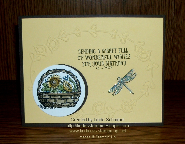 Let’s begin with the “Pretty Paisley” textured embossing folder … this is your first step in creating this card. I love the way the oval encompasses the greeting and our dragonfly, then brings your eye right to your focal point … the basket of flowers.