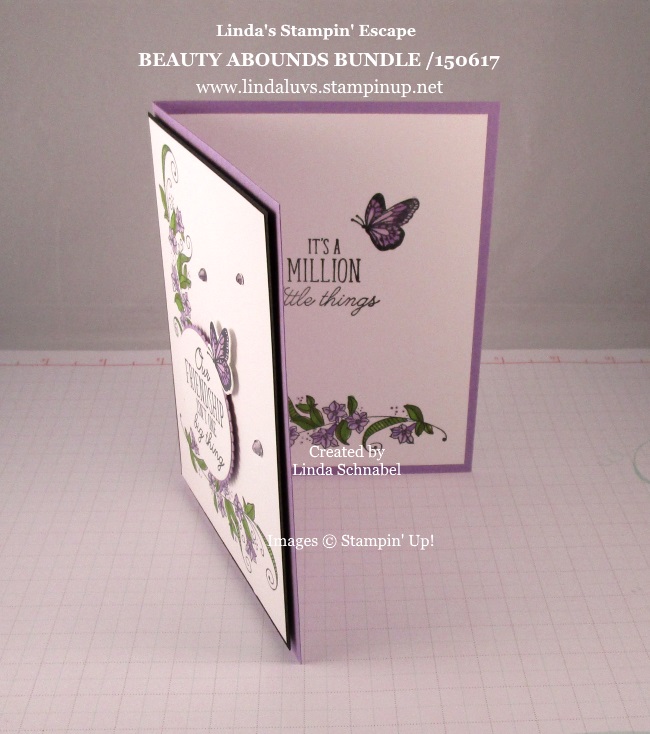 The beautiful greeting was die cut using the Layering Circle Framelits, and popped up with Stampin’ Dimensionals … as was the butterfly. We added just a touch of the Wink of Stella (not visible on the photo) in the center of our flowers and then gently over our butterfly to give it a hint of sparkle but not overpower. We also added some Rhinestones which were colored with the Dark Highland Heather Stampin’ Blends.