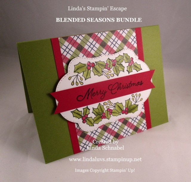 The greeting is from the Blended Seasons stamp set and was stamped in Cherry Cobbler and punched with the Triple Banner punch. I also sponged the banner with Sahara Sand to age it a little. The combination of all these single entities created a warm holiday card.