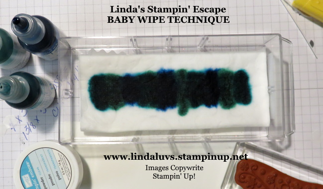 I am using Pool Party, Coastal Cabana and Pacific Point. You begin by laying out your baby wipes (I used the kind from the $ $tore) and then you add a few drops of ink in each color onto your baby wipe…