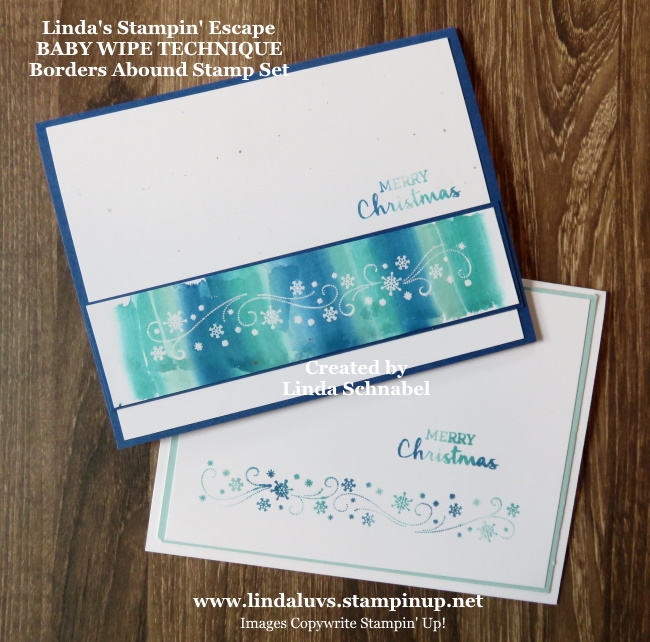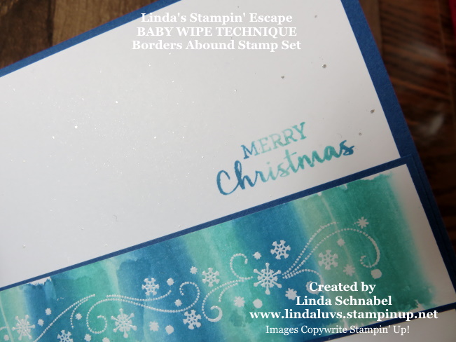 I chose these colors because I picked the snowflake border from the Borders Abound stamp set … now you can use this “inked” baby wipe as your new multi-colored stamp pad. I’m starting simple on my first card ….
