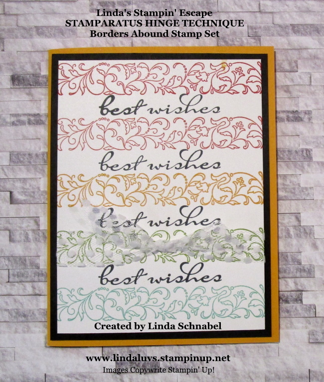 I used the filigree border from the Borders Abound stamp set and aligned it onto my cardstock and then picked up the stamp with my plate … now you’re ready to stamp! The colors used are Poppy Parade, Calypso Coral, Mango Melody, Granny Apple Green, and Coastal Cabana …. each color was achieved by moving the plate down hinge by hinge.