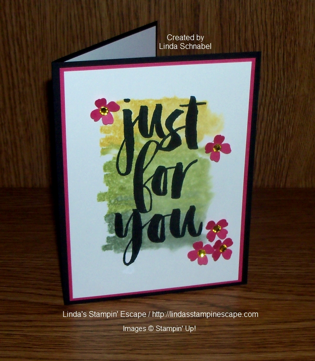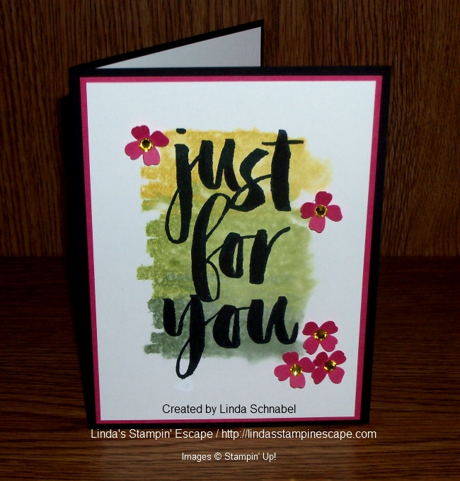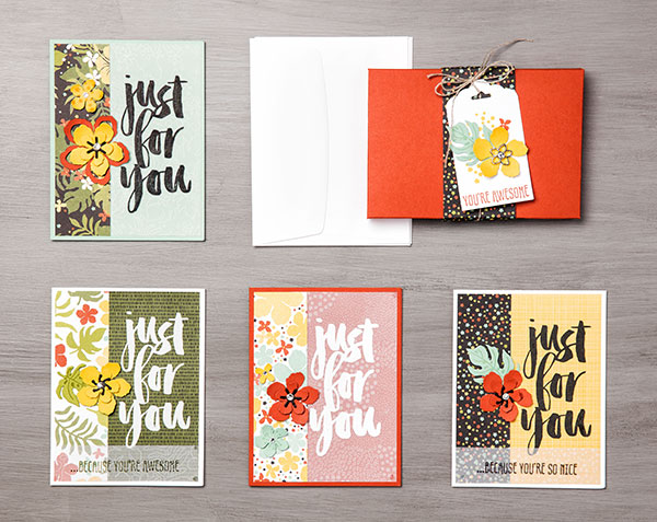 Awe … and you couldn’t find a better greeting to send some flowers to a friend than “because you’re awesome”. This comes from the Sale-a-bration stamp set “Botanicals for You”. You can get this stamp set for free with a qualifying order of $50 (before shipping & handling).