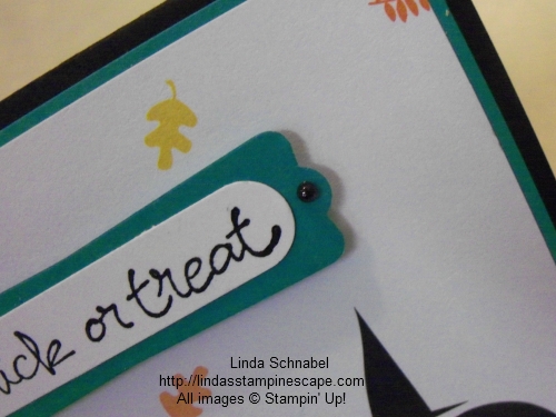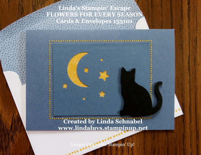 My apologies for using the “retired” moon & stars … Looks like I need to check my catalog a little closer, but it does look nice with our Cat silhouette. I colored the polka dots with my Stampin’ Blends … one touch and they were “Bumble Bee”. I also used it on the envelope (and a ruler to guide me)