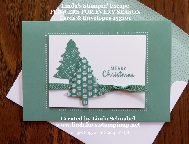 I punched the tree from two different patterns, added the ribbon with a bow (it is Christmas) and our greeting comes from the “Arrange a Wreath” stamp set. I used this stamp set for the rest of my cards today.
