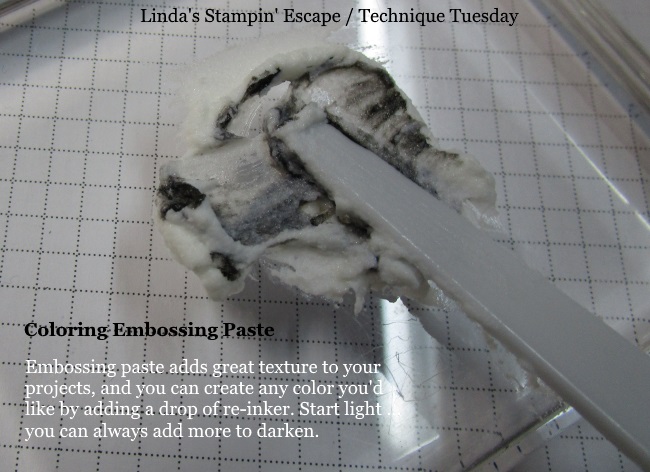 First; What is Embossing Paste? It’s a product that is super easy to use and adds great texture to your projects! Apply it over decorative masks, then let dry for easy texture. This paste can be changed to any color you desire with a drop or two of your ink refill! In fact, this paste is so fun and can be used in so many ways … I have decided to host a class!