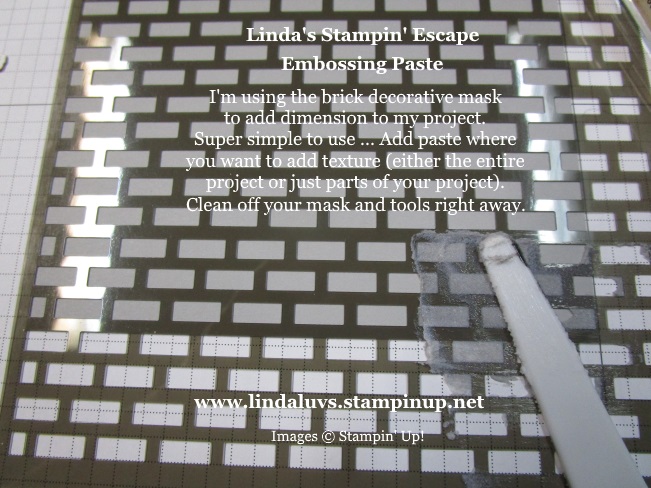 There are 4 masks included in the decorative mask package offered by Stampin’ Up! I will be using the brick pattern in the project today and will be doing just partial texturing verses adding the paste over the entire project …