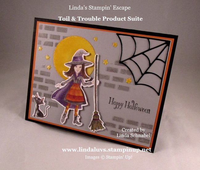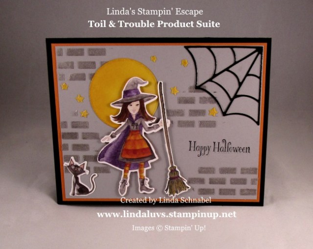 I actually colored my paste Smoky Slate, same as my card front … the texture is so cool on the card!! There are actually several techniques used on todays card! Besides the Embossing Paste, did you know that the dies in our bundle coordinate with some of the images in our Toil and Trouble Designer Series Paper!! Only the broom is stamped and colored … the cat and witch are from the designer paper.