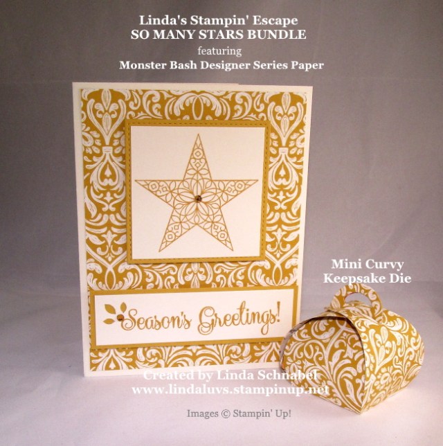 The card is done in Crushed Curry and Very Vanilla taken from the designer paper. The star image was stamped onto the vanilla and was cut out using the Layering Squares Dies. Now if you are just getting into stamping, you won’t need the dies, just cut them out with your paper cutter. The cute rhinestone in the center comes from the Holiday Rhinestones!