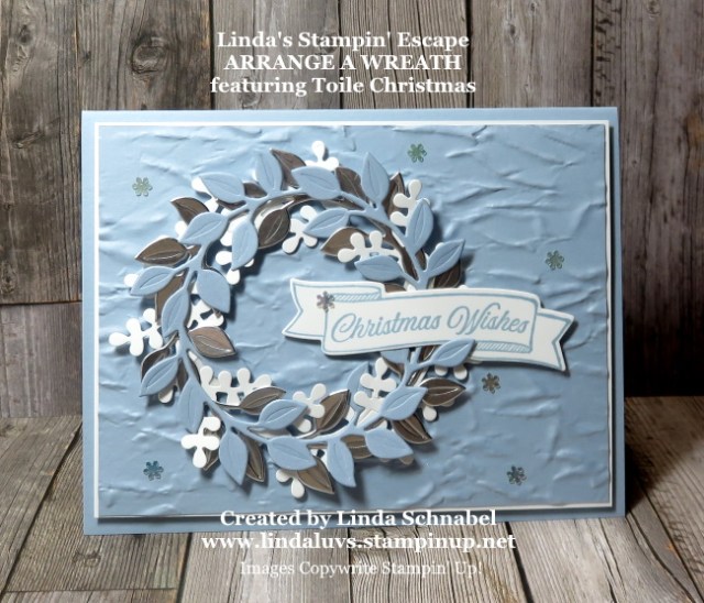 We made it through Monday!! I have a beautiful card to share with you that I have created while working on my Holiday Catalog Virtual Retreat Party. Today’s card features the Arrange a Wreath Bundle and Toile Christmas stamp set.
