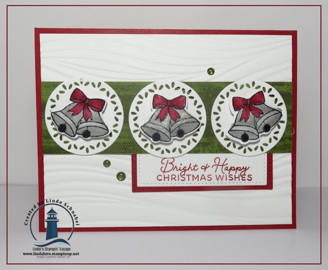 The bells were popped on to decorative circles die cut from the Spotlight on Nature dies, layered onto a strip of “Season of Elegance” Designer paper … and a background created with the Soft Waves embossing folder …