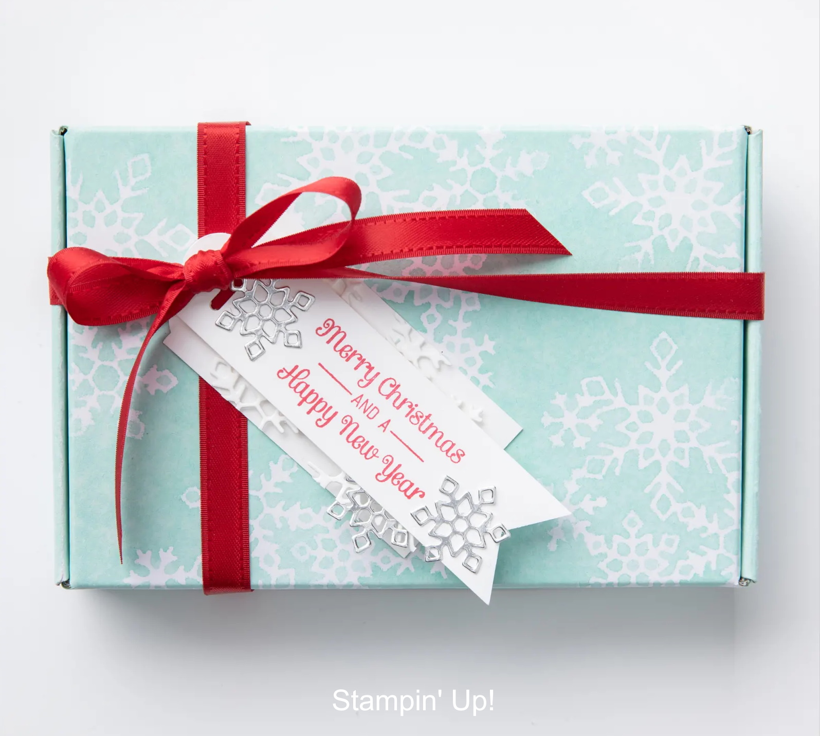 My second card is so different from the first in that we have created our own “Shimmer” paper by spritzing the beautiful Seaside Spray from our 2019 – 2021 In Color collection. For a little more sparkle, the snowflakes are cut from the Sparkle Shimmer Paper! But wait … there is one more layer of sparkle when I added the Rhinestones to the snowflakes.