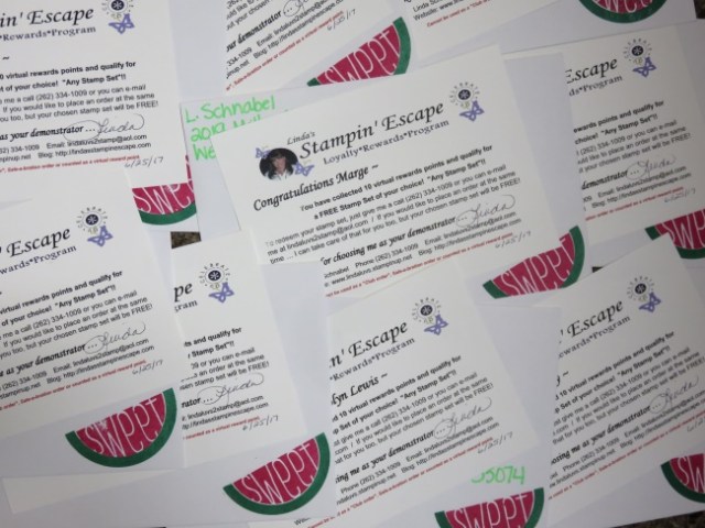 Speaking of the Virtual Rewards points … I sat down and updated everyone’s cards and I’m excited to be able to send all these “rewards cards” out to my customers!! Watch your mail box … they should reach you by the end of the week. You can always find out how many points you have by contact me … lindaluvs2stamp@aol.com