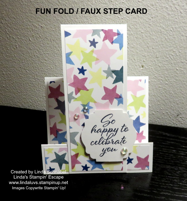 You need 3 pieces of designer paper; 4″ x 3″ … 4″ x 1″ (those will go on the base of the card). The 4″ x 1″ goes on the smallest panel to the front, then skip a panel, and then the 4″ x 3″ piece will go on the 3rd panel. The third measures 2″ x 5-1/4″ which goes on the step portion of your card.