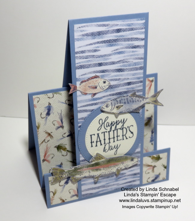 You are seeing 3 different patterns of cardstock … one with the flies, the second that looks like water and the third in which I fussy cut 3 fish from. I love the contrast on this card and of course it works so well together, plus it highlights the fish.