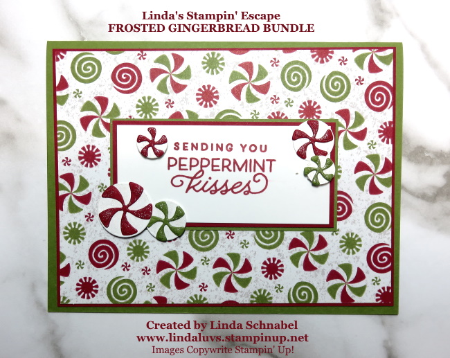 This simple layout is sweet when you need to create many Christmas cards and all of those candies brighten anyone’s day. An Old Olive base, a layer of Cherry Cobbler and then the Gingerbread & Peppermint Designer Series paper created our card front.