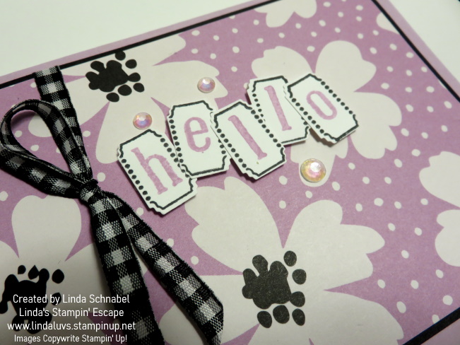 My pattern choice today was the fun floral in Fresh Freesia and Basic Black. I matted my paper with the black and chose the Fresh Freesia cardstock as my base. Once layered I added the Black & White 1/4″ Gingham Ribbon which I tied in a cute little bow.