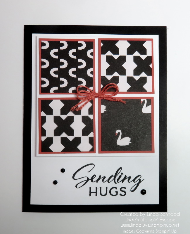 I was not sure how I wanted to use those big X’s, and the other pattern… well, it kind of hurt my eyes!! lol But cut into smaller blocks (1-1/2″ x 1-1/2″) we tame them down and create a cute design of blocks. I love the little swans so I added them into my Black & White themed card … it is what gave my my pop of color.
