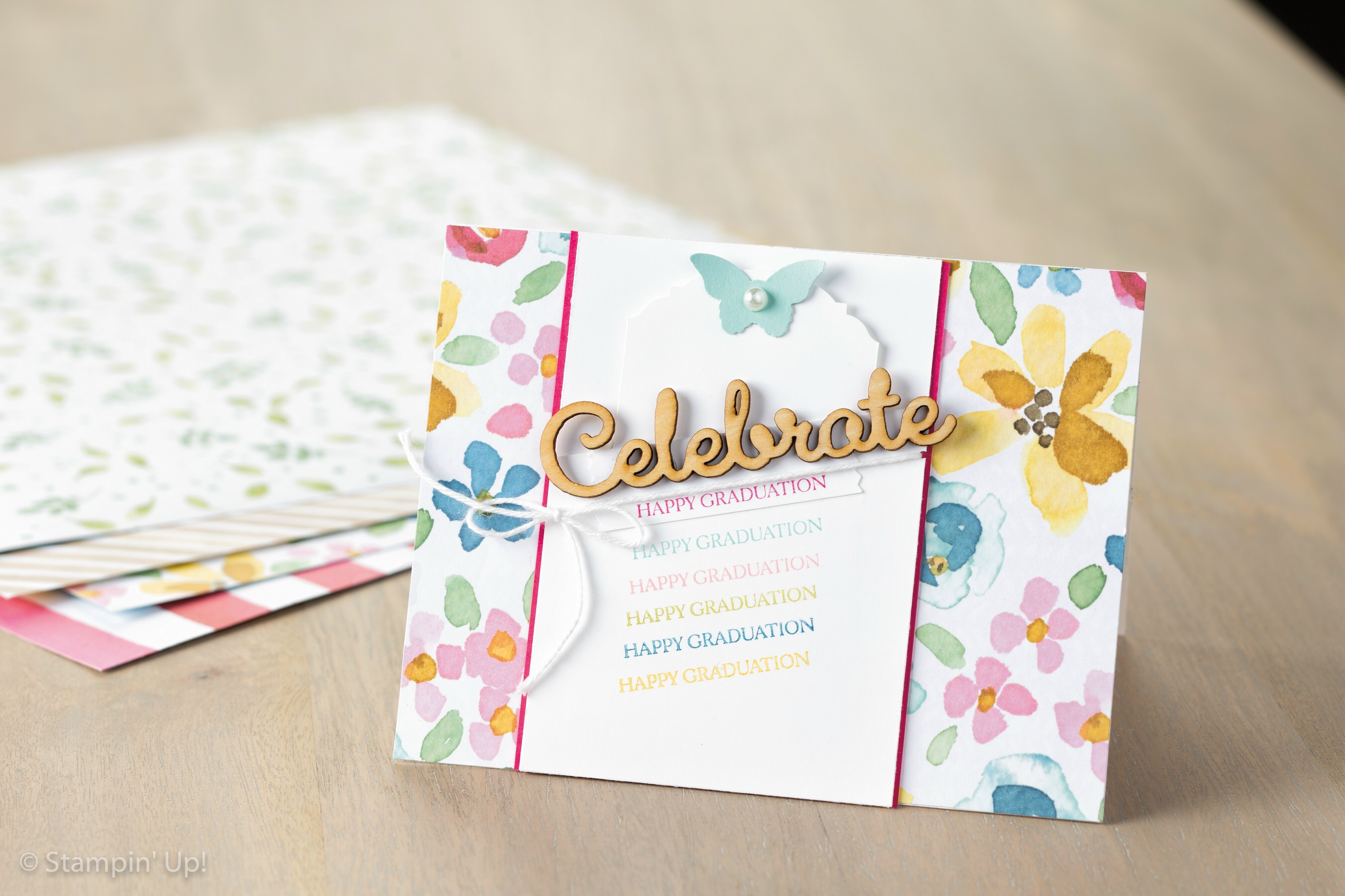 The cute little banner was punched from Blushing Bride with the Banner punch and adhered to the back of the greeting. The entire greeting was popped up with our Stampin’ Dimensionals.