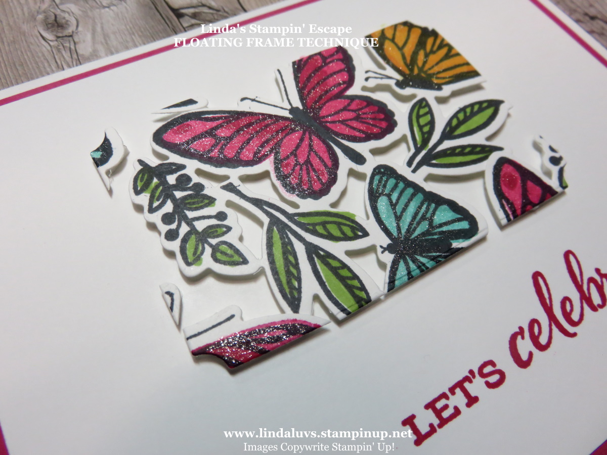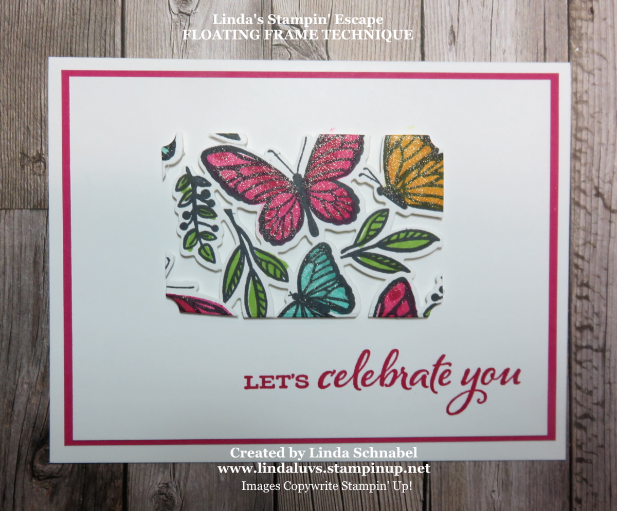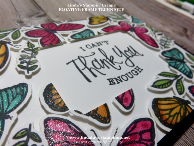The Floating Frame Technique; it takes a little patience but as my stampin’ friend Olivia said “I like you get 2 cards for your effort- and they both look great! I will be trying these cards soon. Also I love press n seal- use it a lot in the kitchen and for things around the house. Never thought to use it for stamping so that just blew my mind! Thanks for the tip”