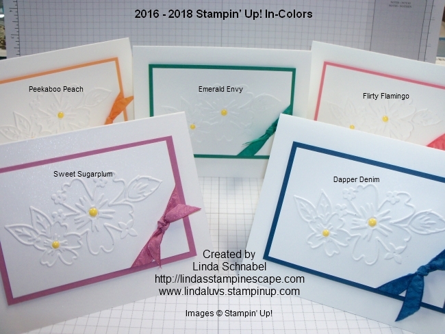 Each year Stampin’ Up! introduces 5 new In-Colors … these colors are what’s hot for the season and it helps keep our Stampin’ Up! colors fresh and fun. If you walk into your favorite stores you will find these colors in the clothing, towels & bedding and home décor departments!