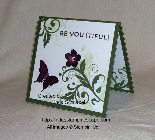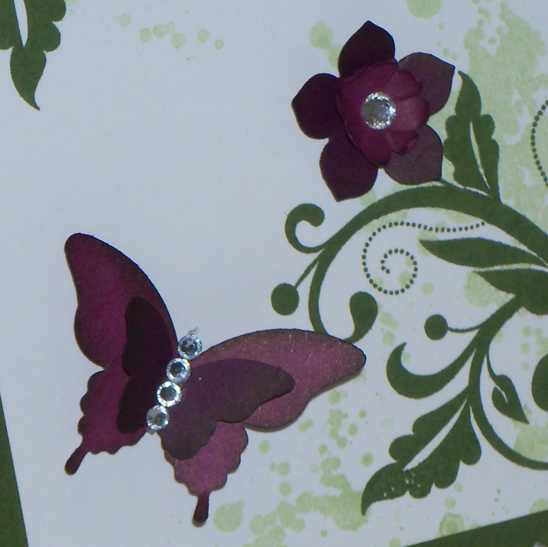 As you can see … I layered the Petite Petals (in Black Raspberry) with the Boho Blossom (in Razzleberry) punches to create my flower. The Elegant Butterfly and Bitty Butterflies also used the above color combination.