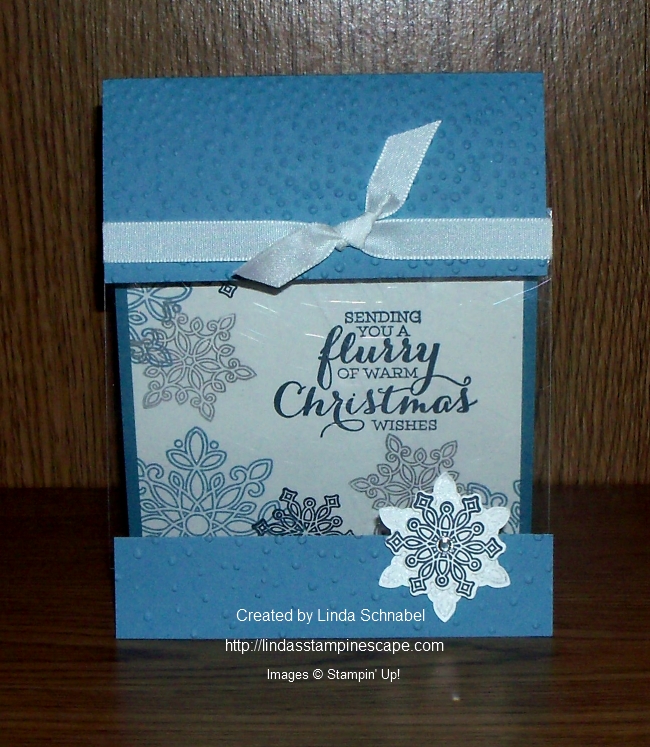 At first glance at the designer paper I got the feeling of a pretty snowfall … the beautiful new Tranquil Tide color, adds to the softness of a snowfall. Kind of brought me back to the days when I was a kid and loved to watch the snow first fall.