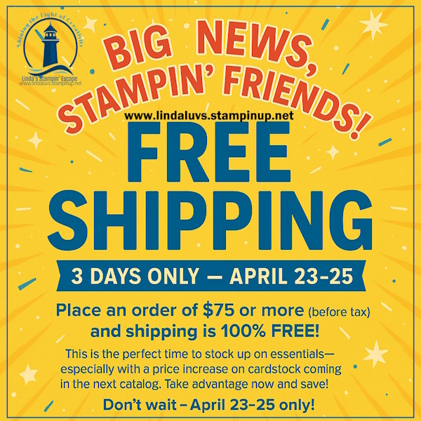 From April 23rd–25th, Stampin’ Up! is giving you the chance to stock up and save — no shipping charges on orders of $75 or more (before tax)! That’s right, your crafty goodies will be delivered straight to your door FREE of charge. No code required — the discount will apply automatically once your cart hits that magic number!