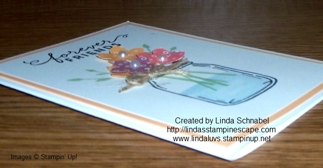 The beautiful greeting was die cut using the Layering Circle Framelits, and popped up with Stampin’ Dimensionals … as was the butterfly. We added just a touch of the Wink of Stella (not visible on the photo) in the center of our flowers and then gently over our butterfly to give it a hint of sparkle but not overpower. We also added some Rhinestones which were colored with the Dark Highland Heather Stampin’ Blends.