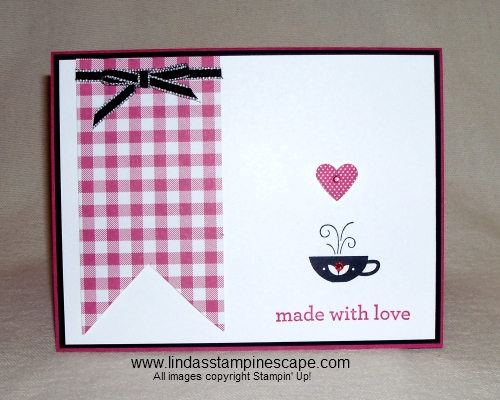 The designer series paper on this card has since retired but the stamp set is “Make a Cake” found on page 17, and the greeting is from the “Sweet Essentials” stamp set, both sets are found in the 2013-14 catalog.
