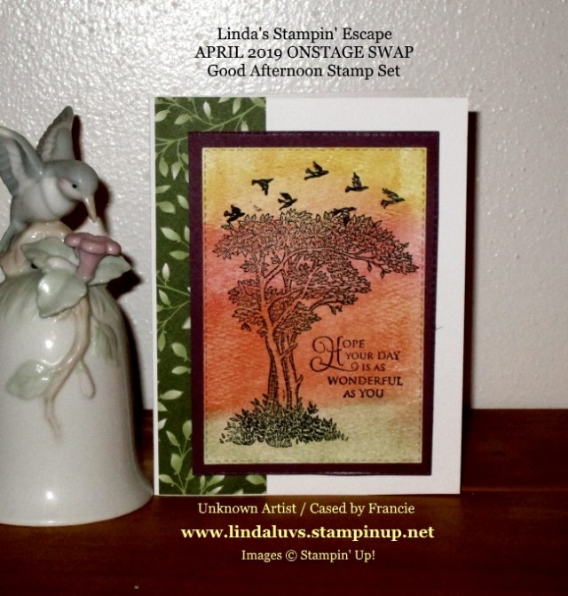 STAMPING SUPPLY LIST FOR TODAY’S PROJECT … If you do not have a demonstrator, I’d be honored to have you as a customer and stampin’ friend. If you like this technique and card and need to purchase supplies, just click on any of the items below, it will take you to my online store. Thank you so very much.