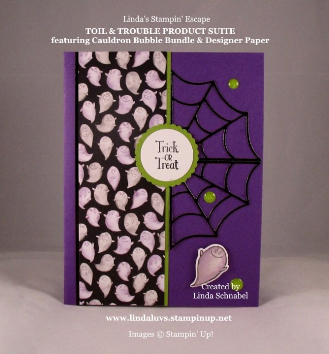 The background was fun and super easy to make … I began with the Gorgeous Grape Cardstock and layered the fantastic Metallic Mesh Ribbon over the top … it creates a creepy web looking background.