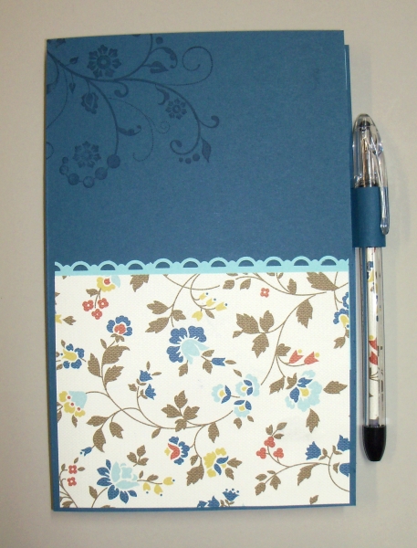 To design the front we stamped the top with the “Flowering Flourishes” stamp set. Then we used “Comfort Cafe” Designer Series Paper … embellished using Pool Party cardstock and the “Scallop Trim Border Punch”.