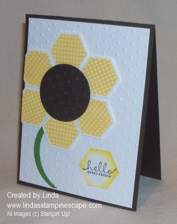 I think the flower is just too cute! I used the hexagon stamp with the “polka dots” and stamped it in Daffodil Delight. The punch makes making petals a breeze!