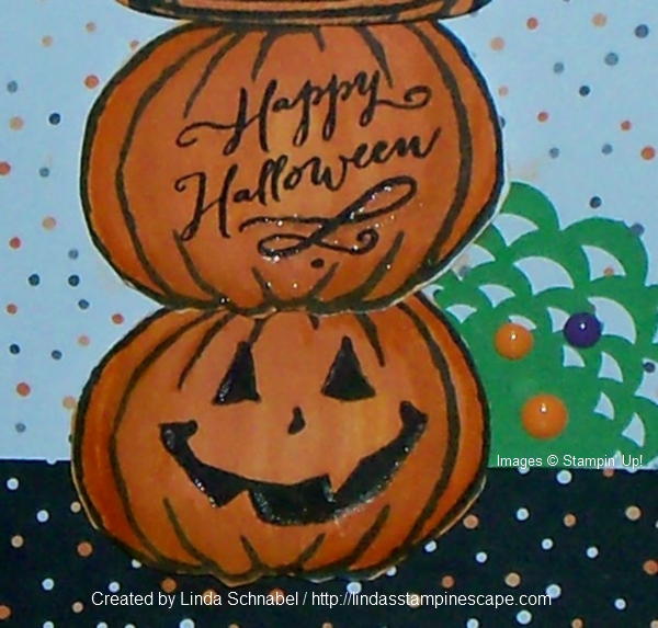 Just as I did yesterday, I water colored my pumpkins using my ink and Aqua Painters. The designer paper and enamel dots are from the “Halloween Nights” product suite, and I used the doily again for an added pop of color. I even added a touch of the Wink of Stella again!