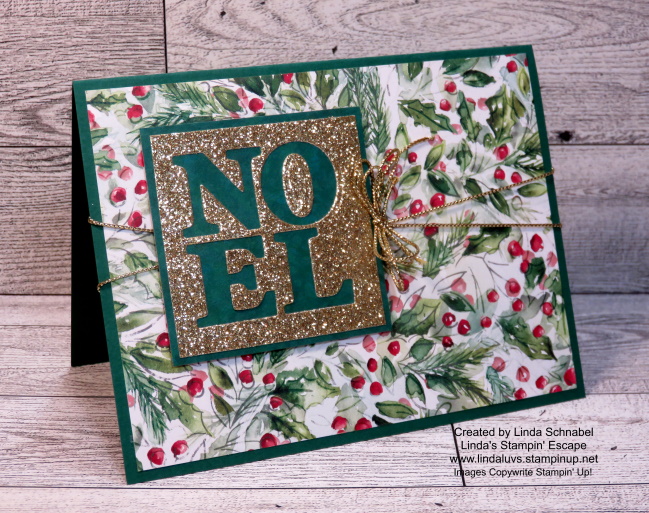 Using the Joy of Noel dies and a die-cutting machine, cut out the word “Noel” from the Gold Foil. This is a great paper saving technique. Now you can attach the Gold Foil to your Cherry Cobbler Cardbase, and the Joyful Designer paper over that. Using Dimensionals, attach your “NOEL” to the cardfront.