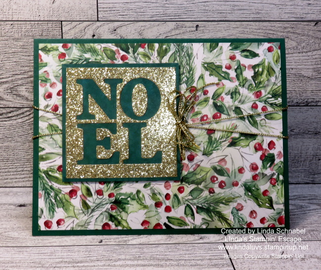 Using the Joy of Noel dies and a die-cutting machine, cut out the word “Noel” from the Gold Foil. This is a great paper saving technique. Now you can attach the Gold Foil to your Cherry Cobbler Cardbase, and the Joyful Designer paper over that. Using Dimensionals, attach your “NOEL” to the cardfront.